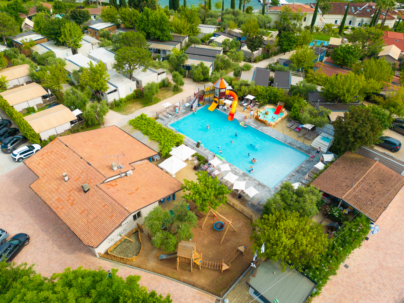 Wenn Sie auf dem Vacanze Camping Boutique ein Mobilheim buchen, dürfen Sie sich auf eine abkühlende Erfrischung im Swimmingpool des Campingplatzes freuen. Im Kombination mit der Sonnenterrasse ist er ein wirklich hübscher Anblick. Ausserdem bietet Ihnen der Pool eine herrliche Aussicht auf den Gardasee. Dieser erweist sich als tolle Alternative, wenn es um Bademöglichkeiten geht. Immerhin befinden sich mit dem Porto Portese und der Landzunge San Fermo zwei beliebte Buchten in der näheren Umgebung.